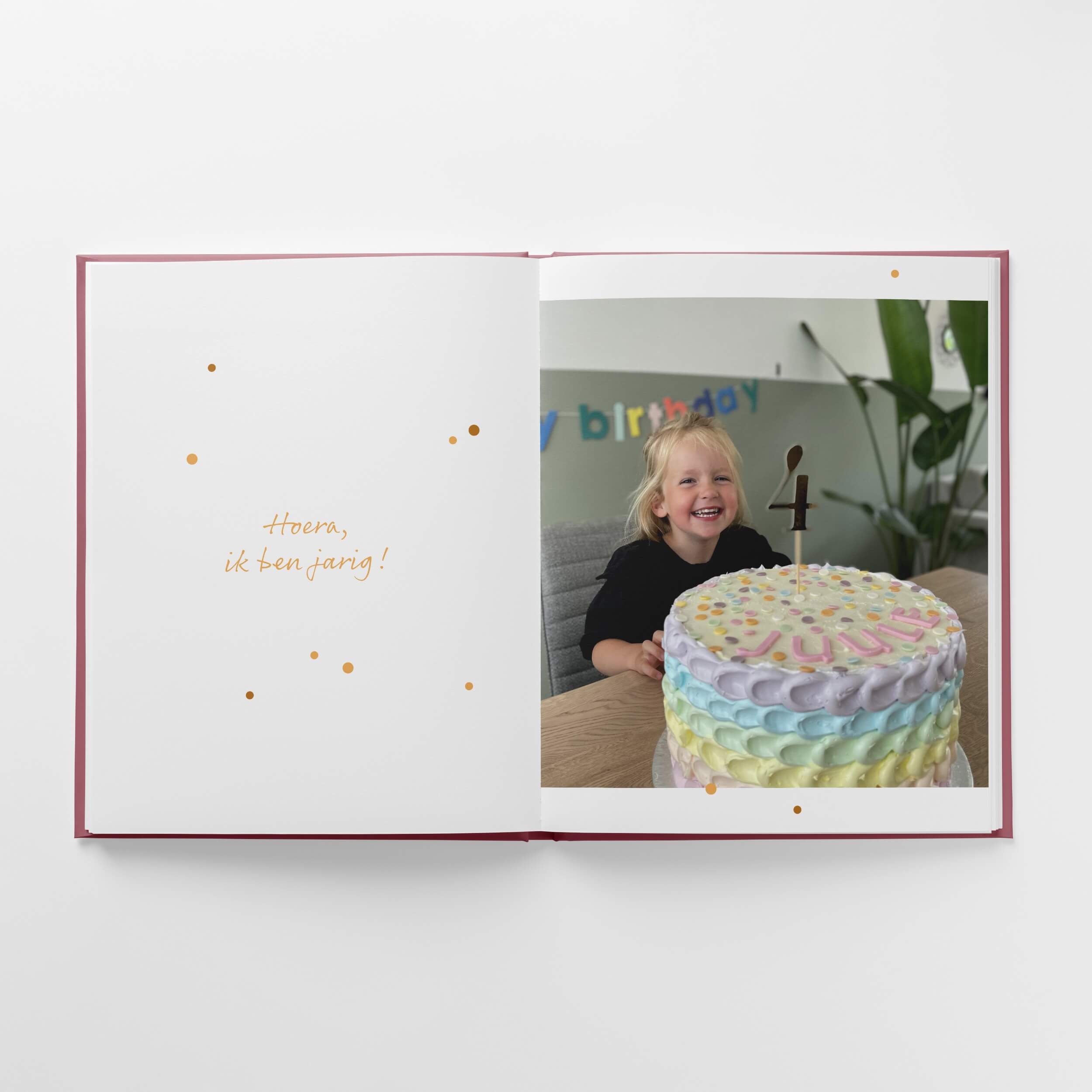 Met mijn design vertel ik een verhaal, dat voel je als je door het boek bladert. Iedere keer zul je weer iets nieuws ontdekken! Kleine cirkels zijn feestelijke confetti - of zijn het nou gekleurde muisjes? - en dan weer een stralende sterrenhemel. Ik wilde graag dat de boeken leuk zijn om vaak te bekijken, voor jou én voor je kindje. De kleuren vormen de basis in dit design, ik heb ze in balans gebracht met het verhaal. Als je goed kijkt zul je zien dat ze precies aansluiten bij de fases die je kindje op de foto's doormaakt. Met dit design wordt niet alleen de fantasie van je kindje geprikkeld, maar ook die van jou!